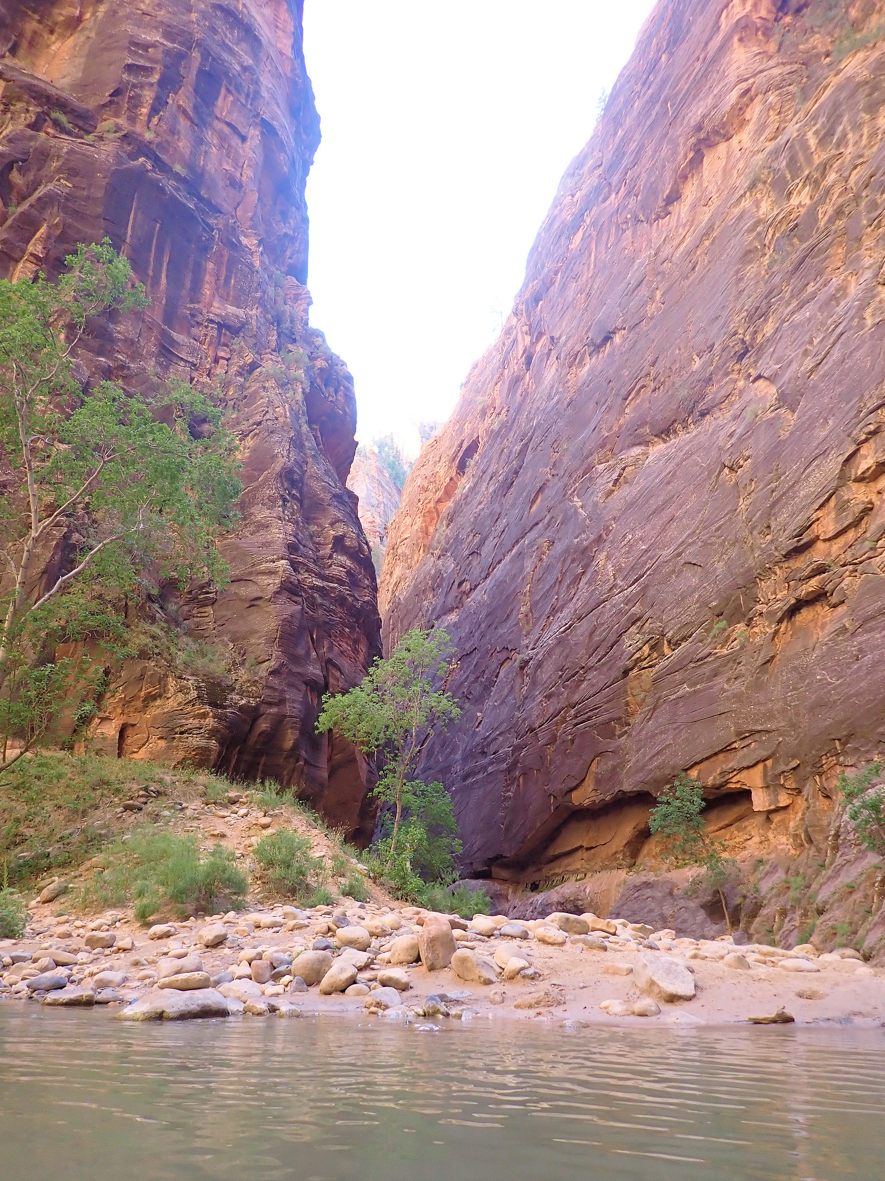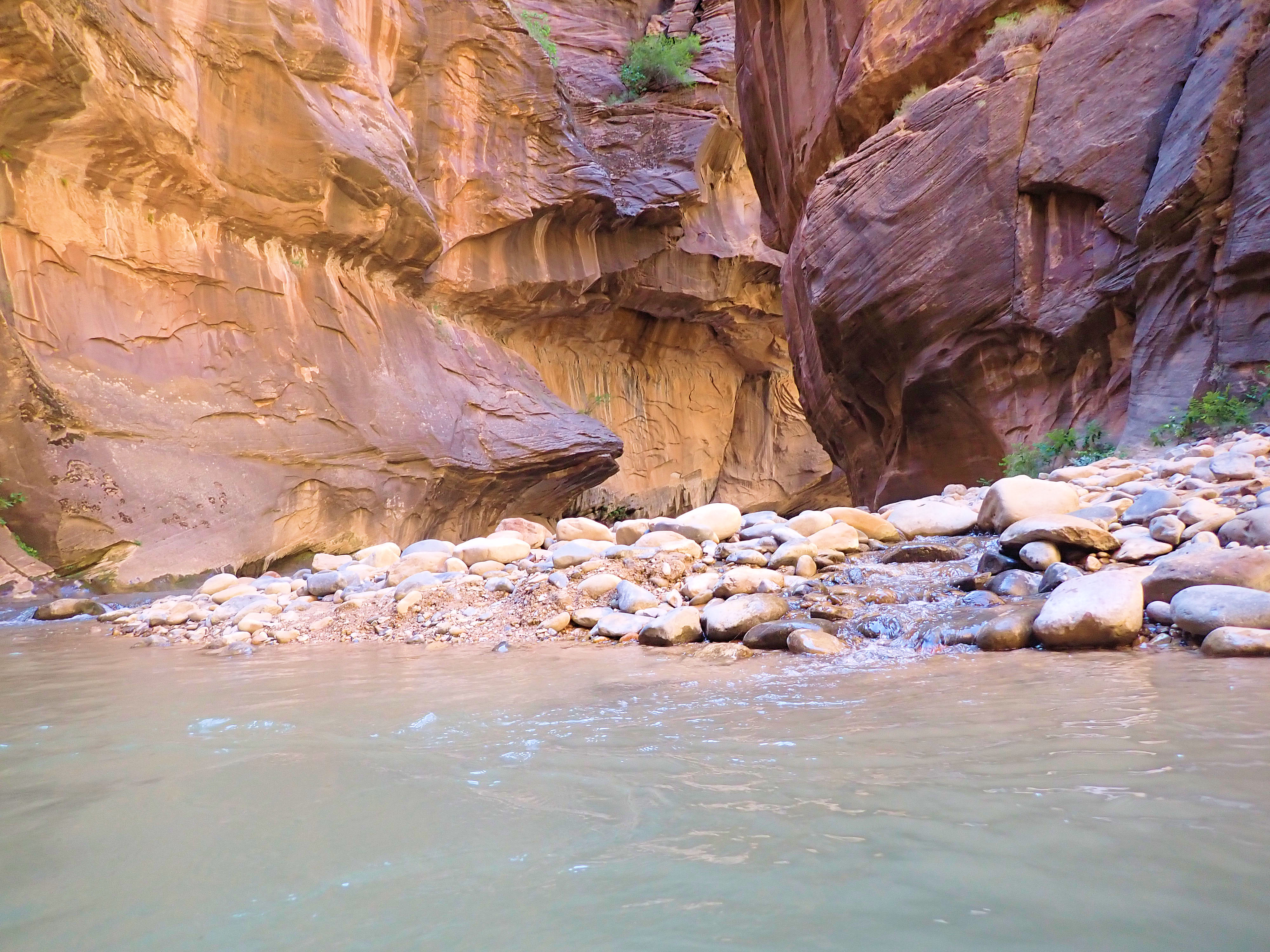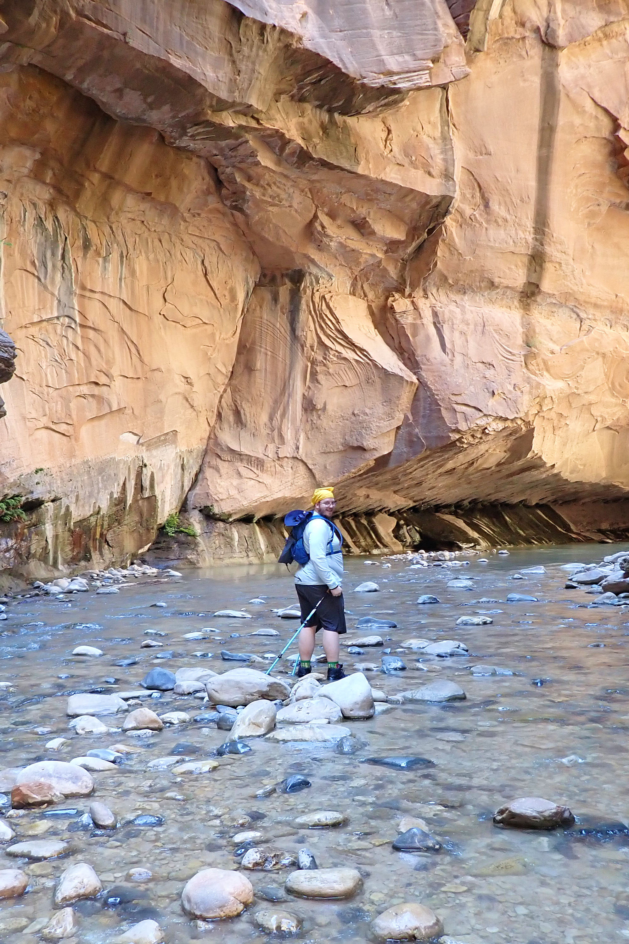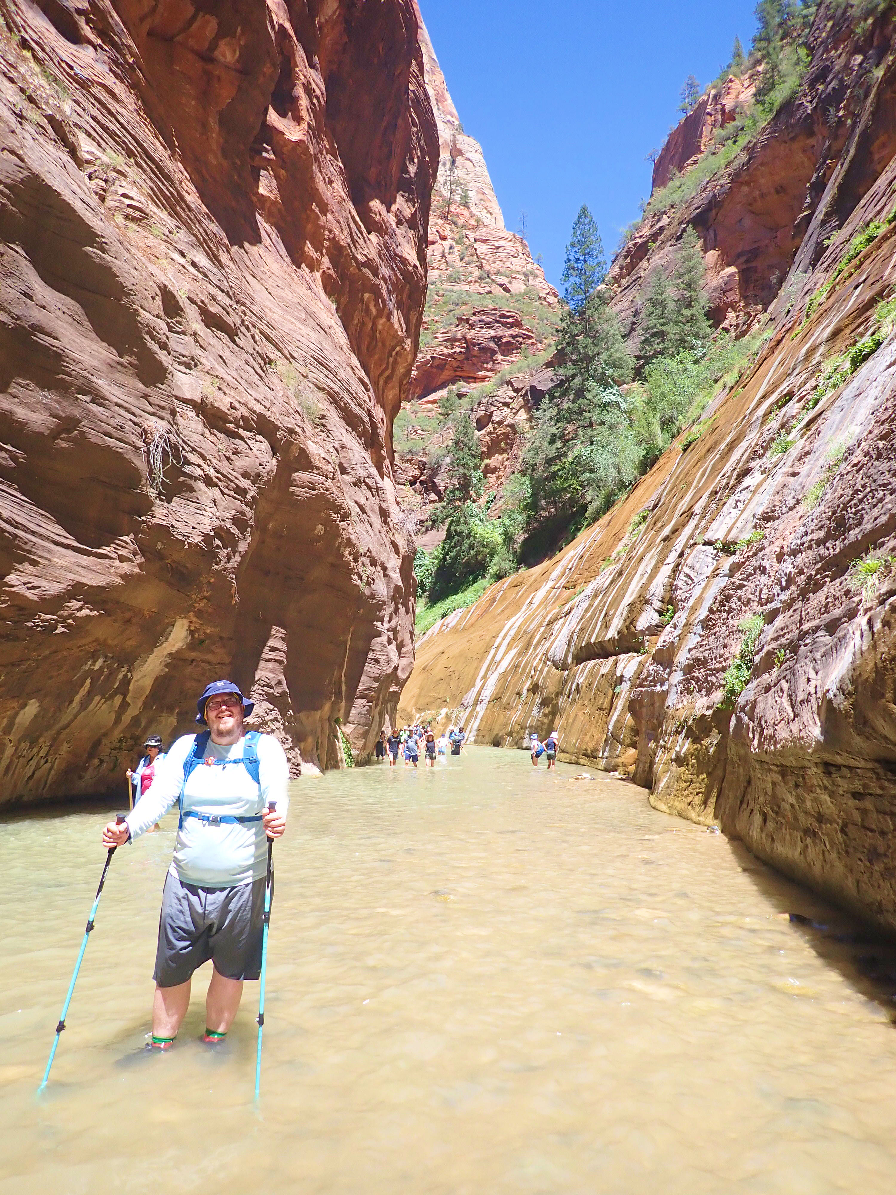 The water was deliciously cool after the mile in the sun getting down to it. We pulled out our trekking poles and off we went. Our plan was to just go as far as we were having fun, but I really wanted to make it to make it to the beginning of Wall Street. Pushing our way upstream was exhausting but we didn’t take many breaks besides to take pictures–which we actually did a lot.