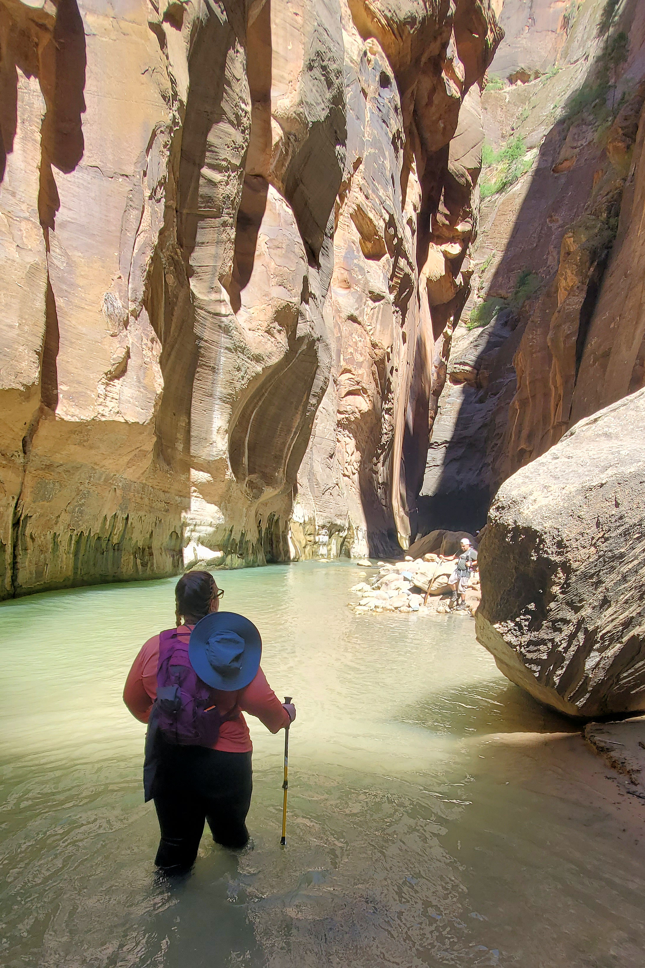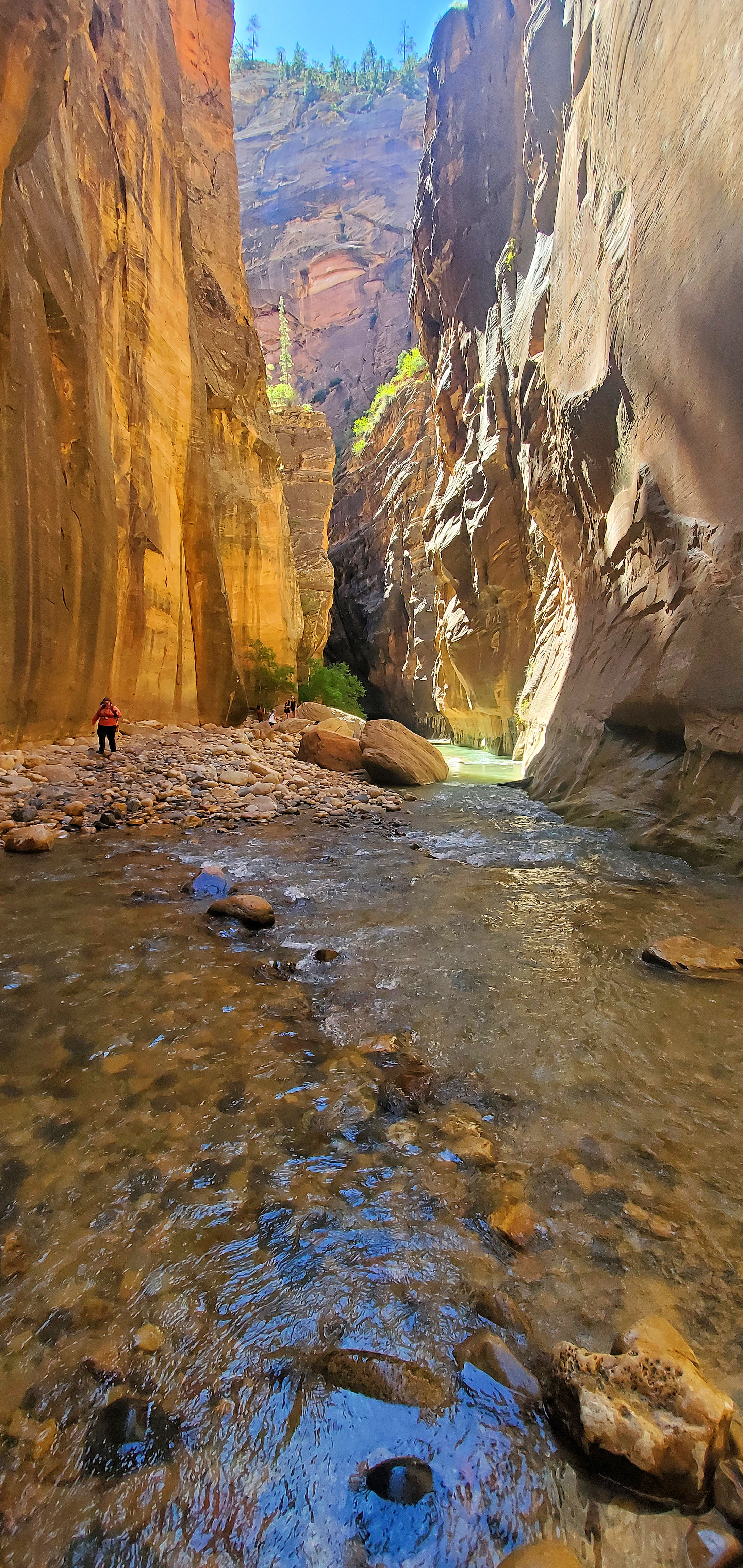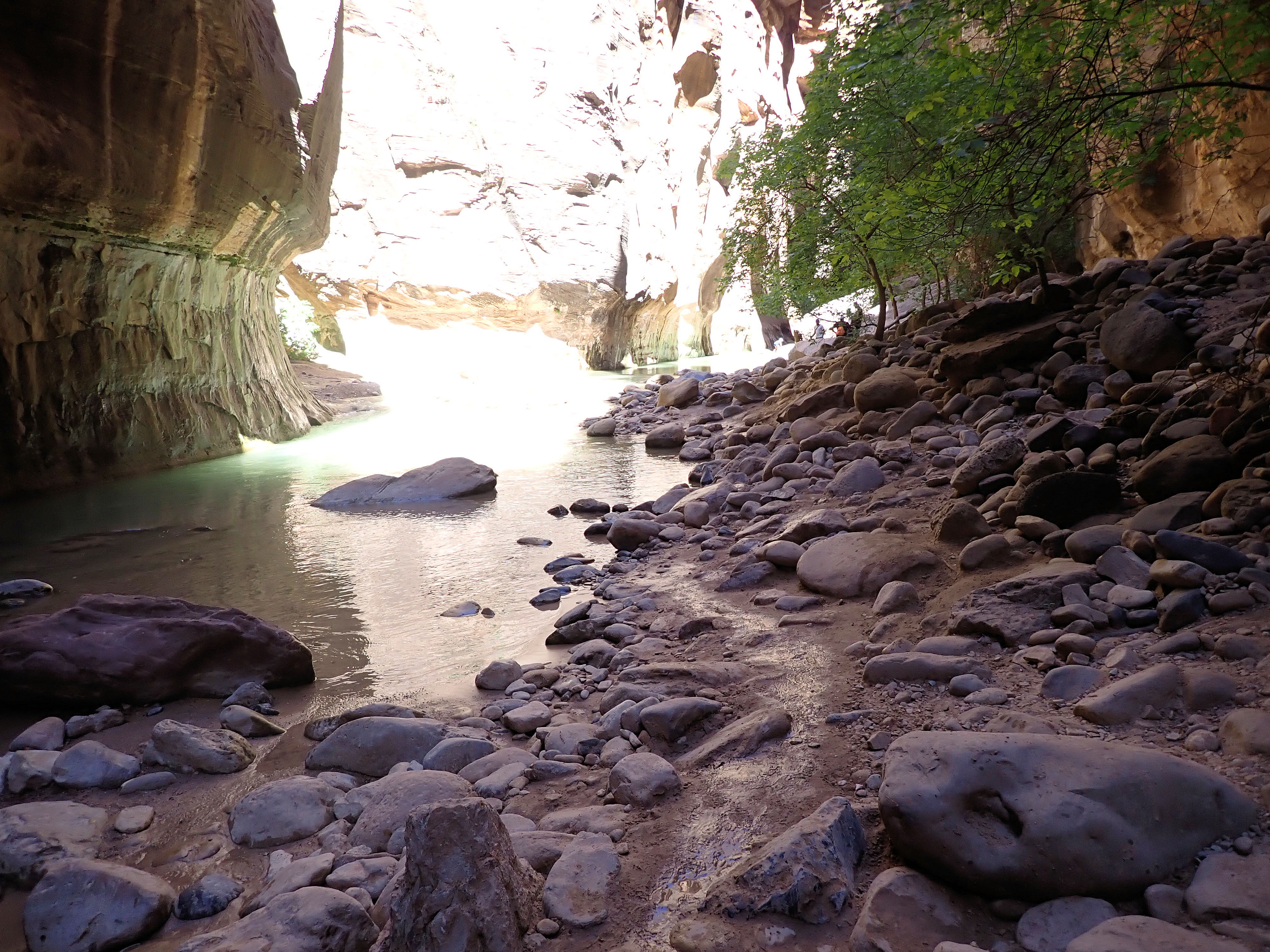 The water was deliciously cool after the mile in the sun getting down to it. We pulled out our trekking poles and off we went. Our plan was to just go as far as we were having fun, but I really wanted to make it to make it to the beginning of Wall Street. Pushing our way upstream was exhausting but we didn’t take many breaks besides to take pictures–which we actually did a lot.
