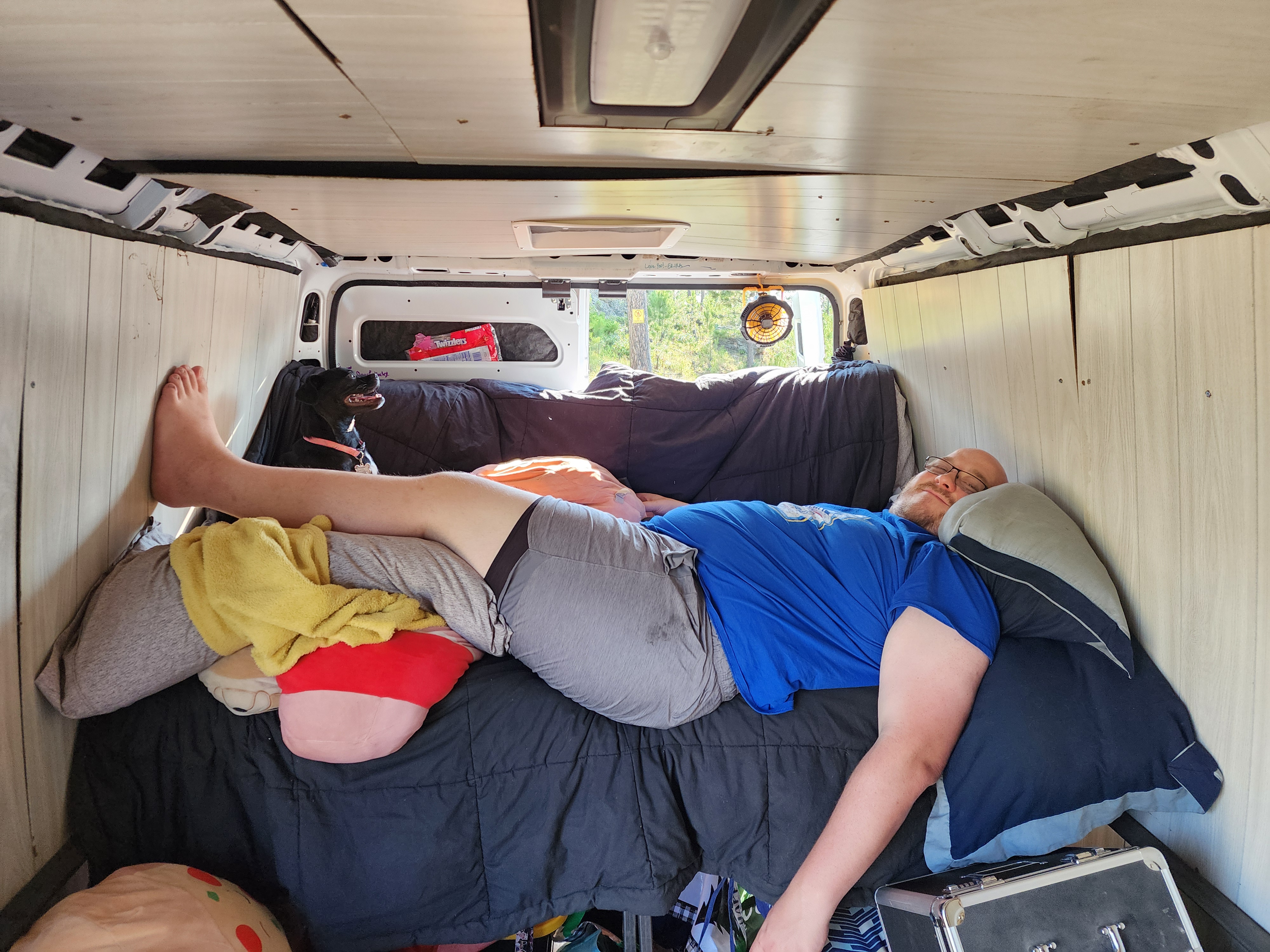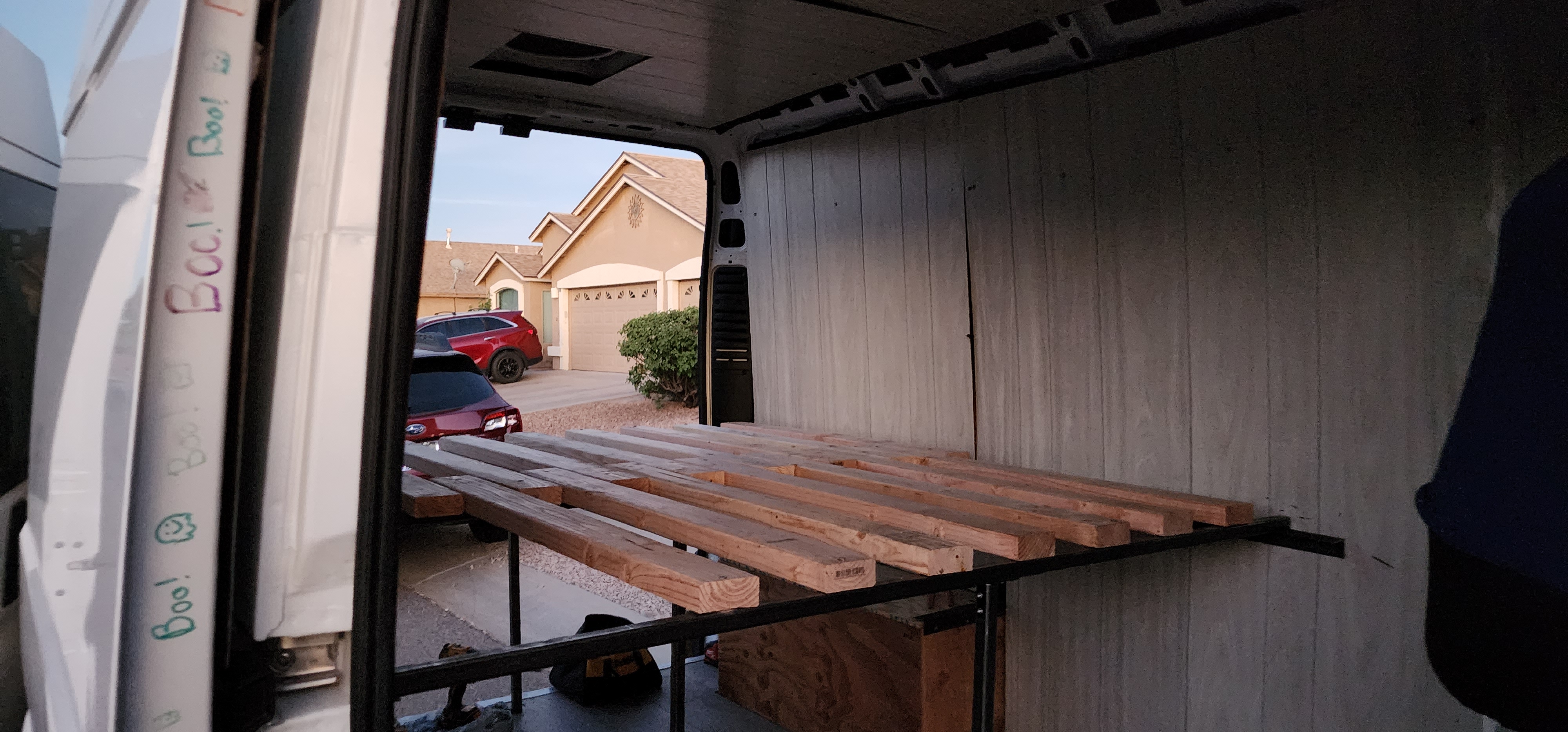 I had found a thorough YouTube tutorial for creating a convertible bed inside a van using a single piece of plywood. It seemed like the ideal design for saving space and it seemed like a project Thomas and I could accomplish despite being very new to any kind of woodworking. We used a circular saw and a jigsaw to cut the wood and meticulously sanded the shapes so they would slide and fit together. Then, we attached angle iron to the walls and used square tubing for the frame and legs of the bed. It took hours of finagling to attach the plywood to the square tubing properly so it would still slide, but we got there in the end.