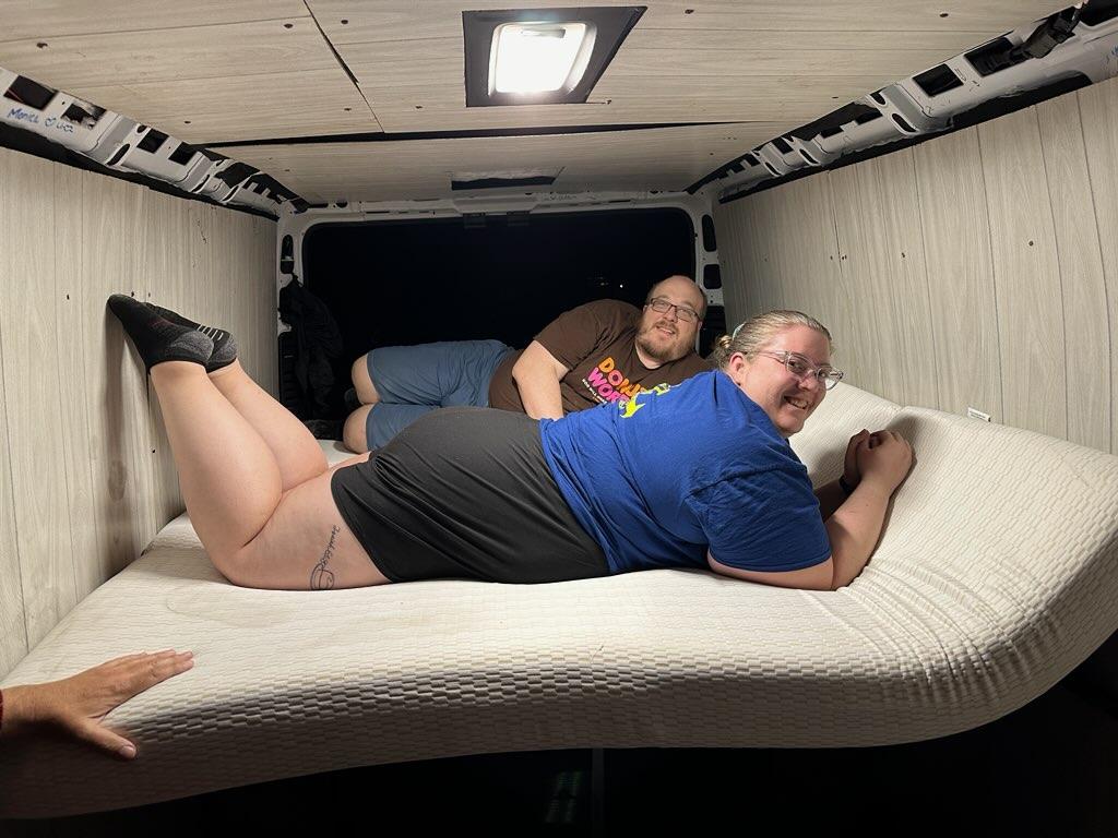 With both Thomas and me being such large people, we knew we needed our bed to be as big as possible and sturdy enough to hold us. We were aiming for a king sized bed which is pretty difficult with the limited space we were working with. We had to finish the walls before we could take final measurements and see exactly how much mattress we could shove in there. It turned out we would have to trim six inches off the width of a king sized mattress, but we wouldn’t have to sacrifice any length.